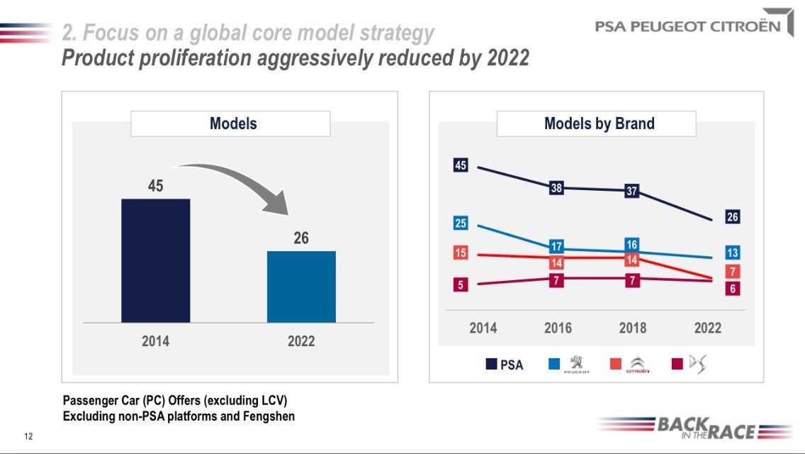 まず、現状の45モデルが2022年までに26モデルに削減されるということですが、これは乗用車のみで、かつ他社からのOEMは含みません。またブランド別では、プジョーの25モデルが13モデルに、シトロエンは現状の15から7にそれぞれ削減され、シトロエンから独立したブランドとなるDSは現状の5から6に増やされる計画です。