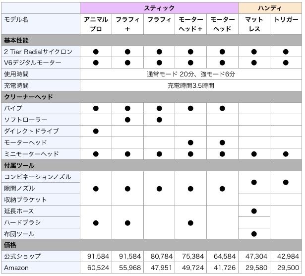 コードレスタイプの主流モデルには「V6」という冠がついています。V6だけで7種類もあるんですね(オンラインショップ限定モデルを除く)。違いを表にまとめてみました。