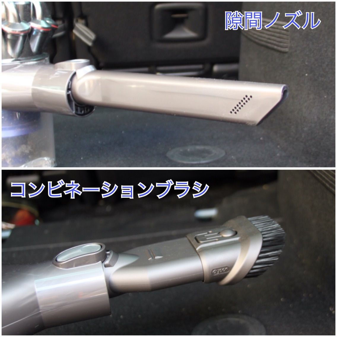 車内清掃で使うのは、隙間ノズルとコンビネーションブラシです。隙間ノズルはどんな掃除機にも付いていますね。コンビネーションブラシは、真ん中のボタンを押すとブラシ部分が引っ込んで平口のノズルとしても使えるものです。