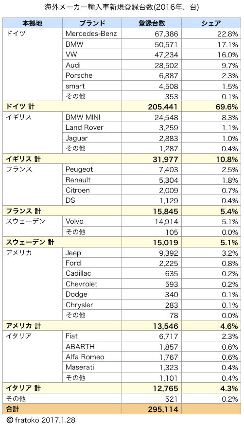 それでは、この29万5千台のうち、米国からの輸入はどの程度だったのでしょうか?下の表は、日本における海外メーカー車の、国別・ブランド別の販売台数です。「ドイツのBMW傘下のイギリスのMINIは一体どこの国のブランドなのか?」といったような細かい議論もあるかと思いますが、それはさておき。
