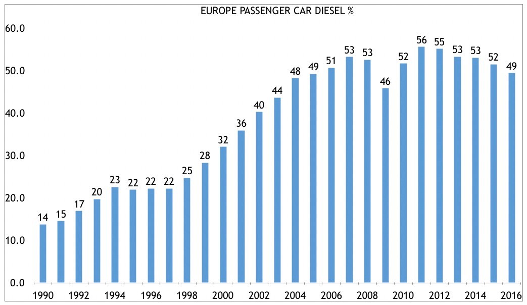そもそも排ガス不正事件が欧州でこれだけ騒ぎになった理由は、もちろん事件の本丸がEUの大国ドイツを代表する世界に冠たる大企業フォルクスワーゲンだったことも当然なのですが、やはり彼の地のディーゼル比率の高さにあるのかと思います。