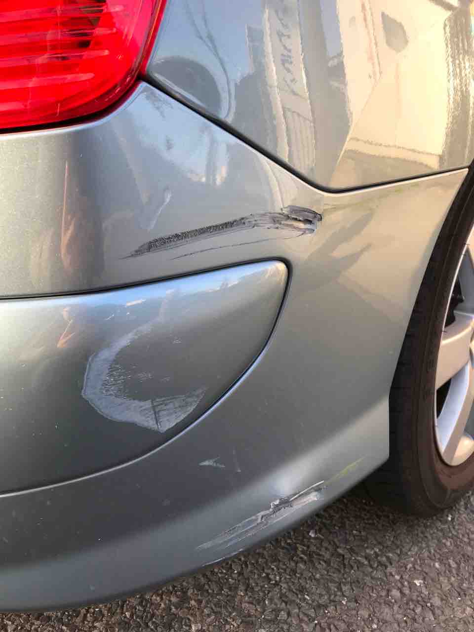 バックソナーもバックカメラもありながら、ダメな時はダメですね。バンパーは上と下の2箇所が大きくえぐれています。