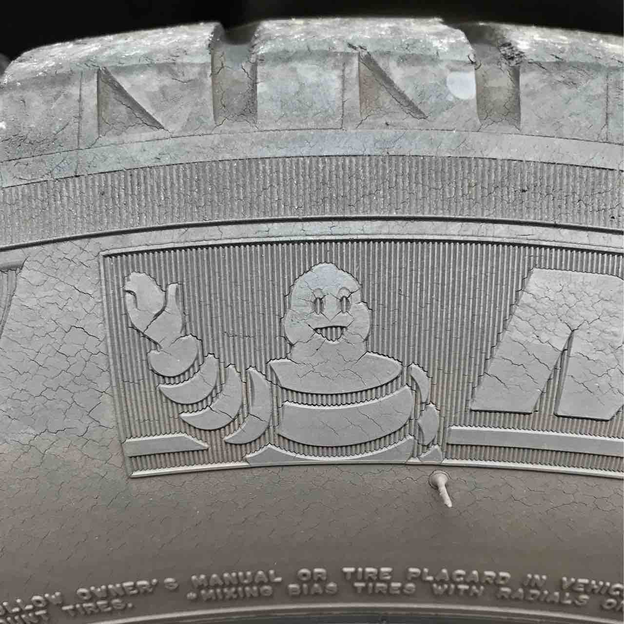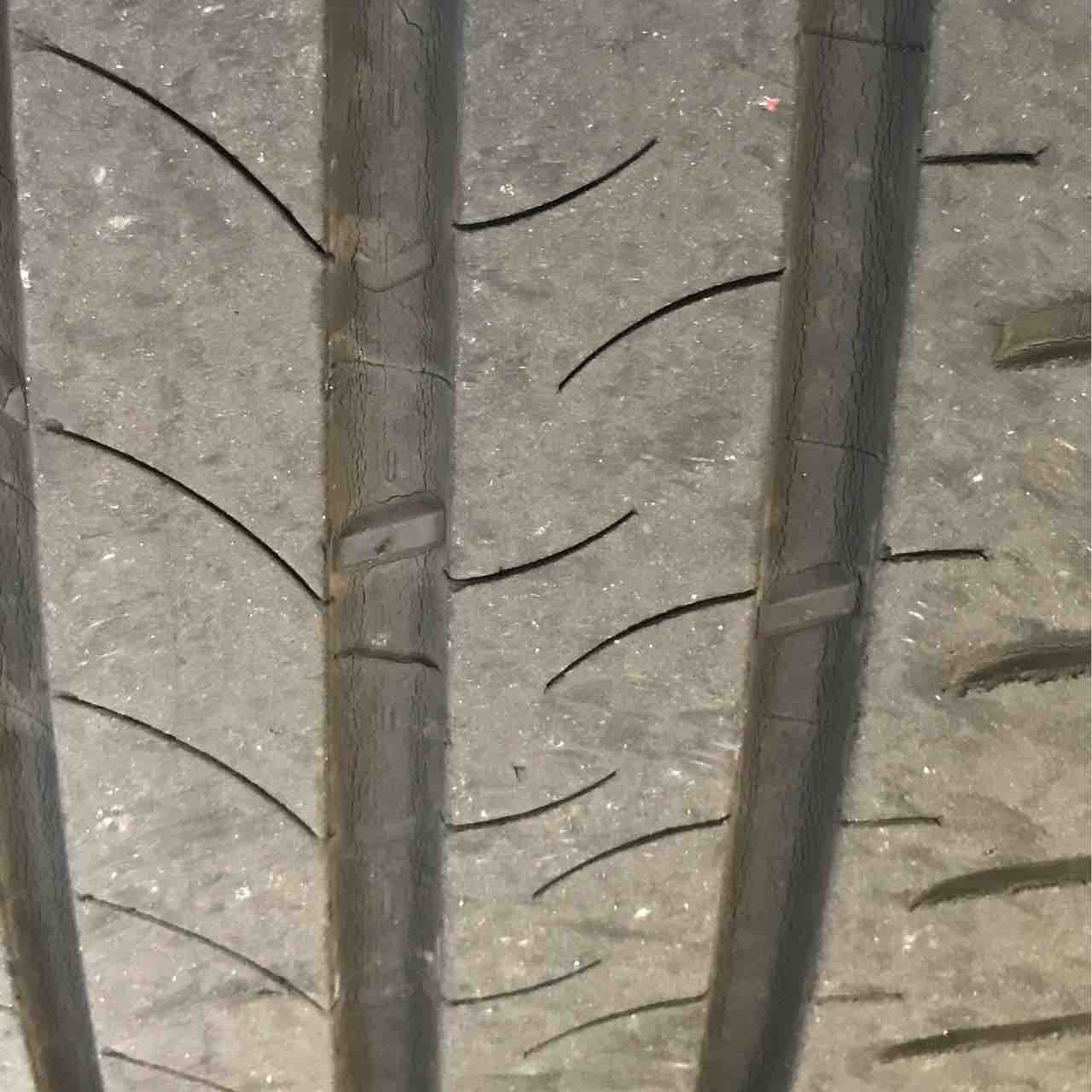 タイヤをまじまじと観察してみると、もう見るからにボロボロです。残溝は約2mmで、1.6mmのスリップサインまであとわずか。