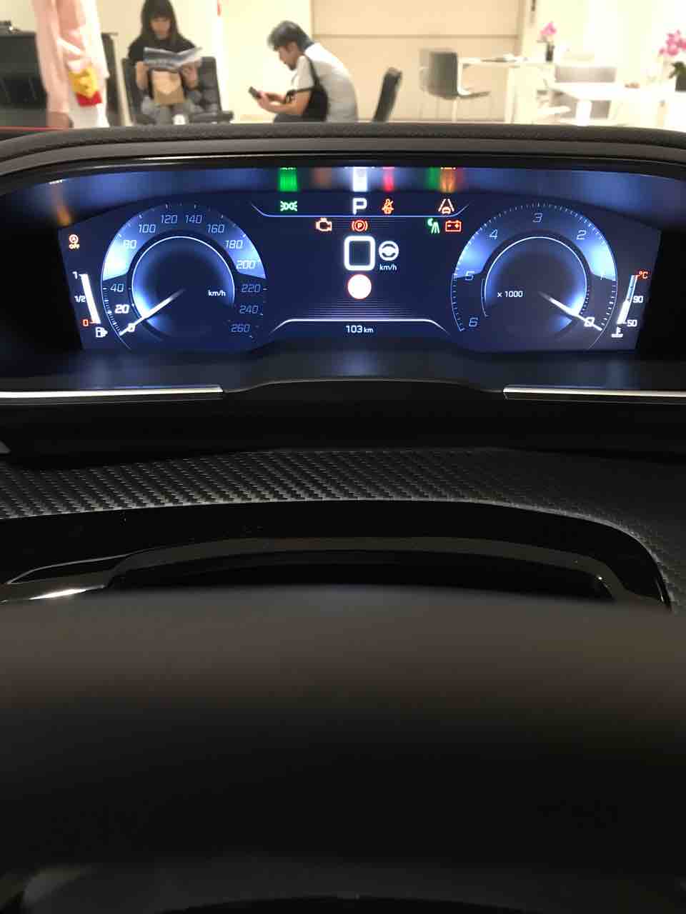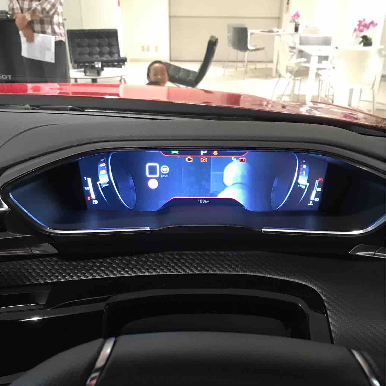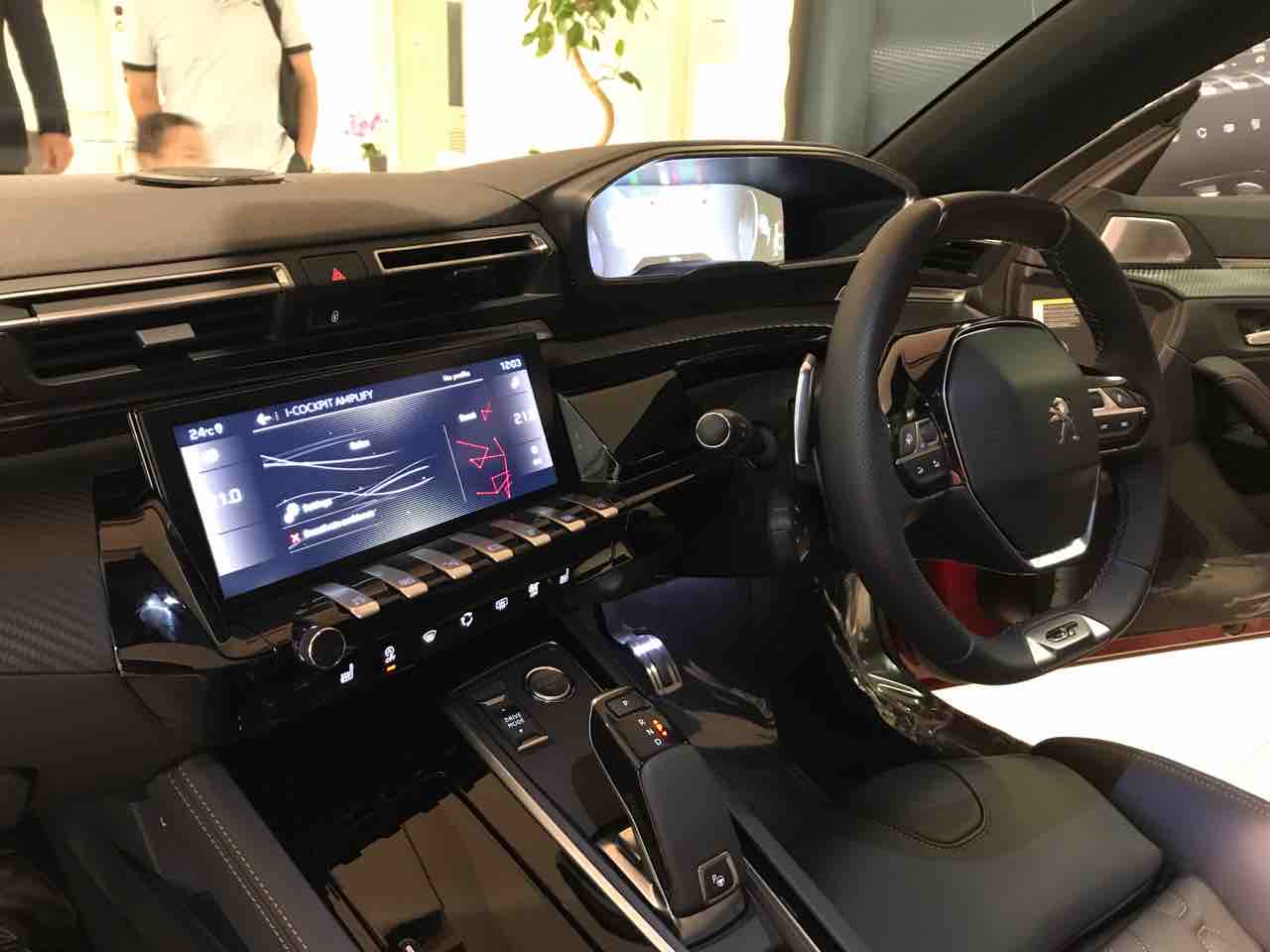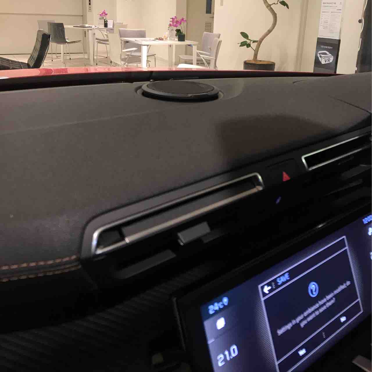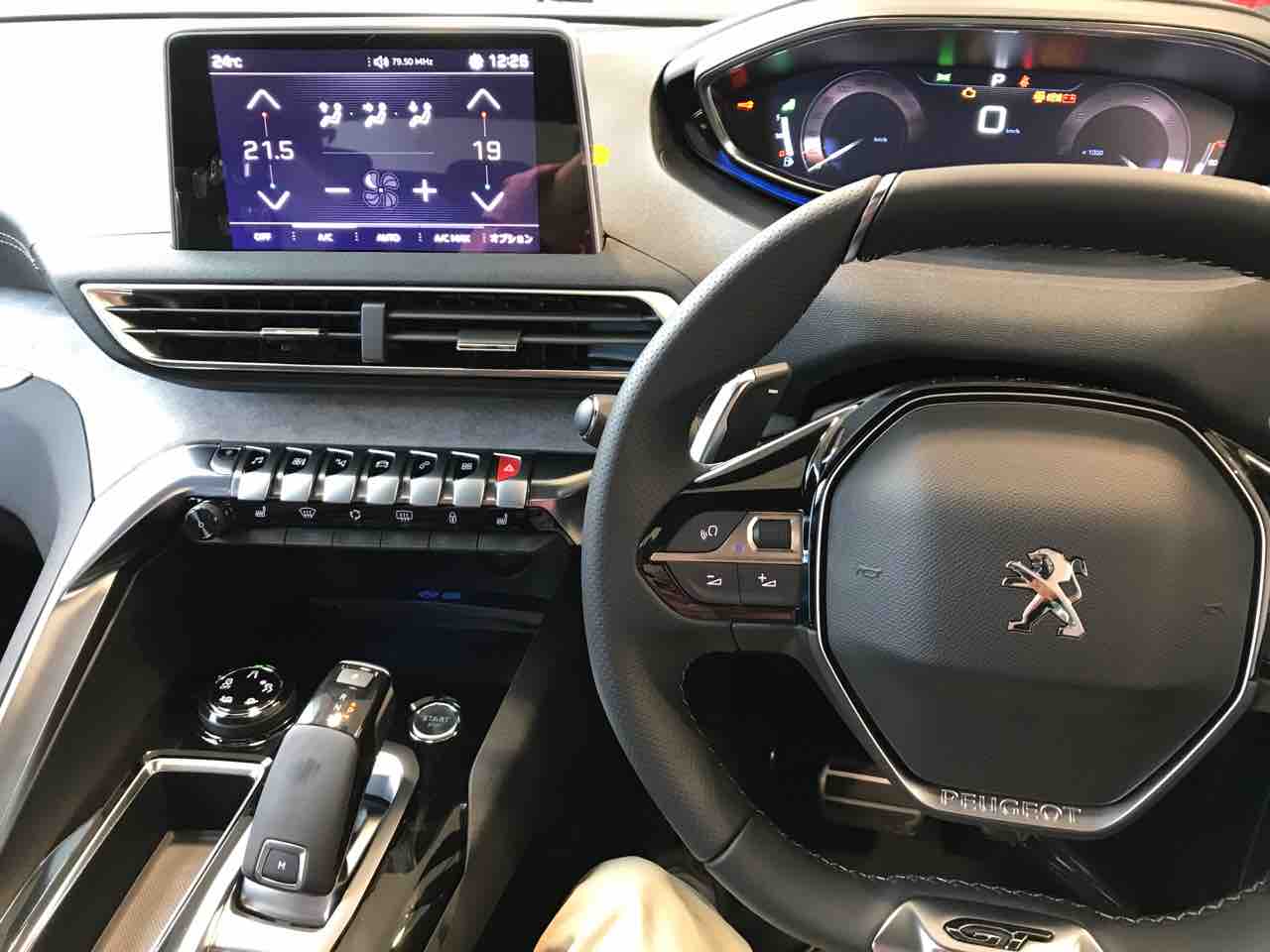 私もそう思ったんですよね。では比較してみましょう。下の画像はショールームに展示されていた3008です。インフォテの位置は508とは違いますが、ステアリングホイールやシフトレバーはおそらく同じパーツを共用しているし、メーターやピアノキーの配置などの基本的な構成は同じです。