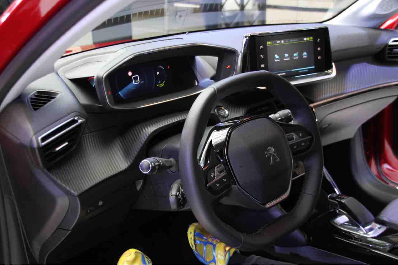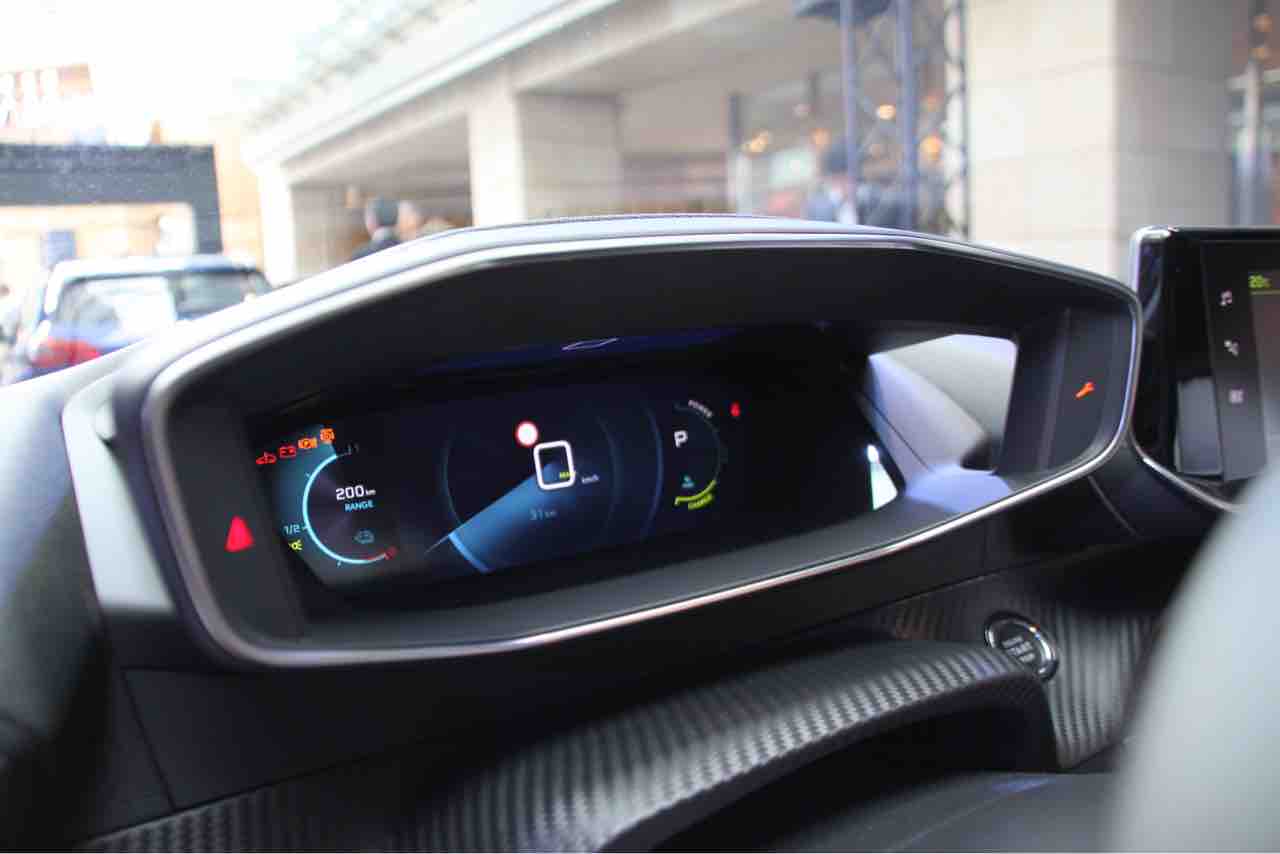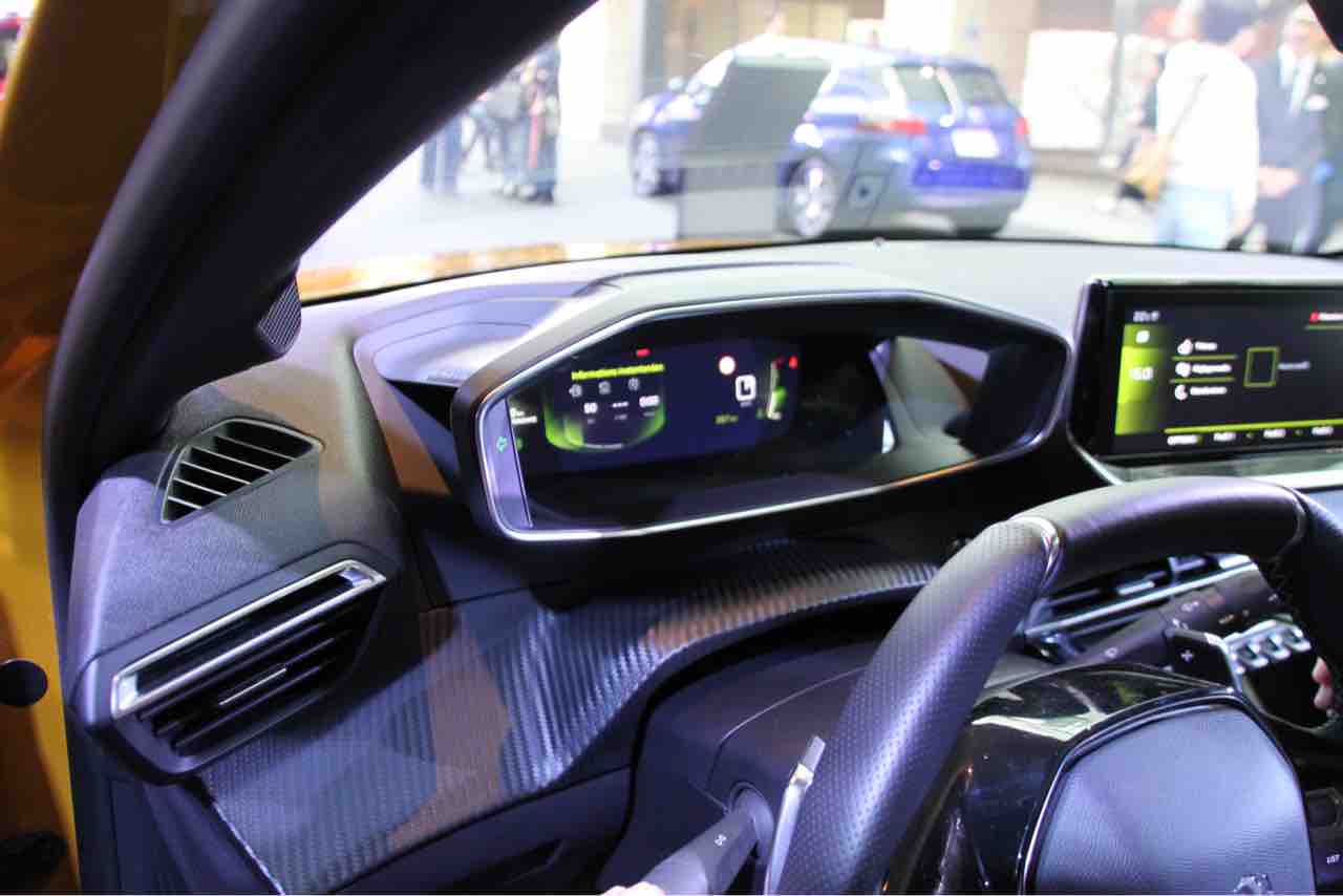 囲まれ感を演出したダッシュボード。コックピットはフル液晶メーターで、内装の質感も先代208より一段上がっているようです。カーボン調のハイライトが効いています。