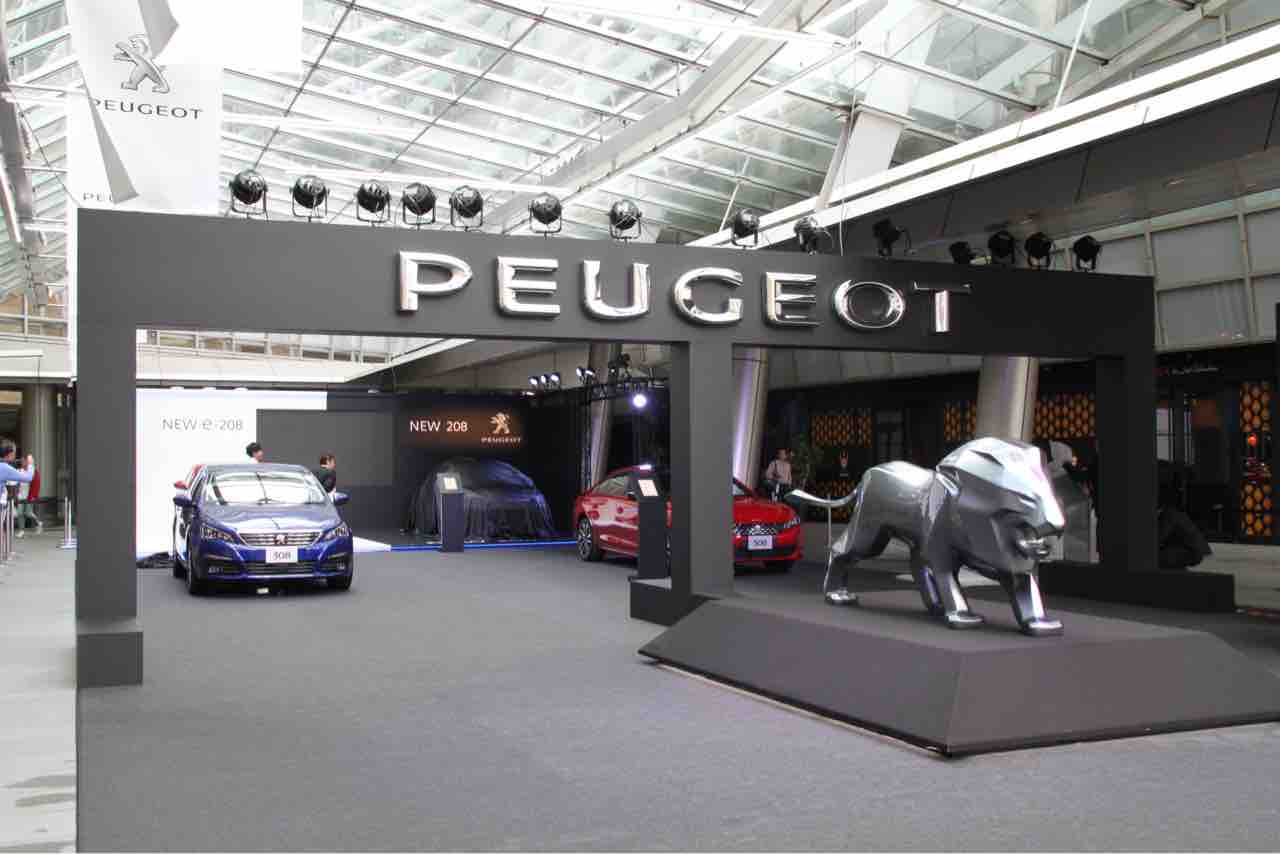 怪訝な面持ちでメインタワーの左手を奥に進むと、ありました。ここがメイン会場ですね。手前に308と508、奥の方に日本初出展の新型208が展示されています。