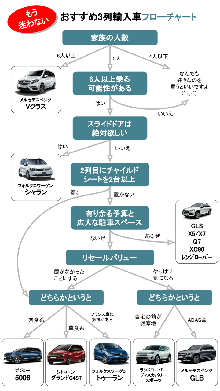 そこで、「3列シート7人乗りの輸入車」を私なりの基準で選ぶとしたら、どうなるかなあと考えてみたのが、こちらのフローチャートです。