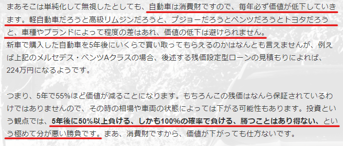 「自動車は消費財なので、毎年必ず価値が低下する。」そして、「100%の確率で負ける、勝つことはあり得ない」とわざわざ太字で言い切っていたのです。