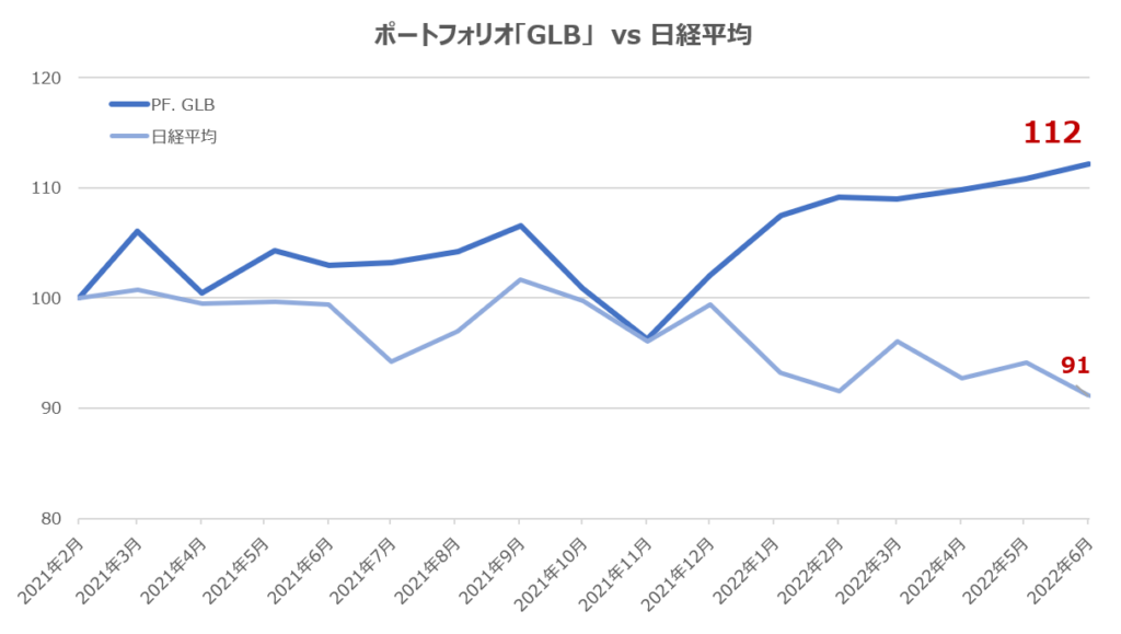 そして個別株の方は、2021年3月初旬に日本企業5社に分散して買い付けています。そのパフォーマンスがこちら。GLBの納車と同じ月に買い付けた5社の株式「ポートフォリオGLB」と日経225の比較です。指数は購入金額の総額を100として毎月の推移を追っています。日経平均は2021年2月末の終値を100とした場合の推移です。